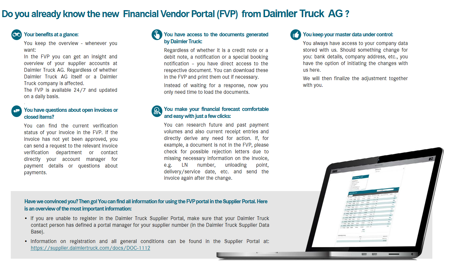 All our suppliers can register for the Financial Vendor Portal (FVP Truck) free of charge. The FVP Truck is a self-service application for suppliers. It allows you to check the status of your invoices, download documents generated by Daimler Truck (credit notes, debit notes, payment advices, etc.), view your master data, and submit direct inquiries regarding overdue invoices. You can find all relevant information about the Financial Vendor Portal Truck here: FVP | Daimler Truck Supplier Portal